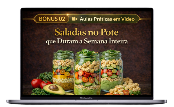 Neste bônus, você terá acesso a aulas práticas em vídeo com 12 receitas de saladas no pote, ideais para quem busca praticidade, organização e alimentação saudável ao longo da semana.